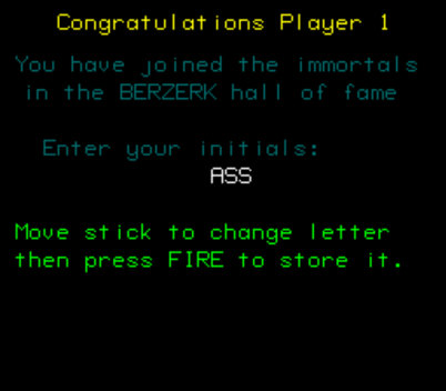 | Graphics: 10 | This was 1980. Let’s be honest with ourselves, back in THAT day and age, this was pretty good. And really, this game’s hard enough as it is- I’m going to agree with Hardcore Gaming 101 and say that had anything more been on-screen than you, the enemies, walls, and laser fire, I’d have never made it past the purple robots. For this game’s purposes, who are we kidding? The graphics are gonna be just fine. |